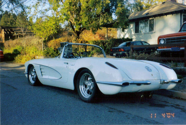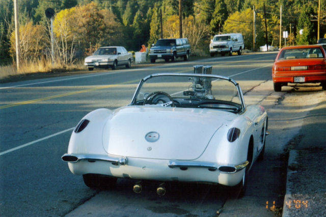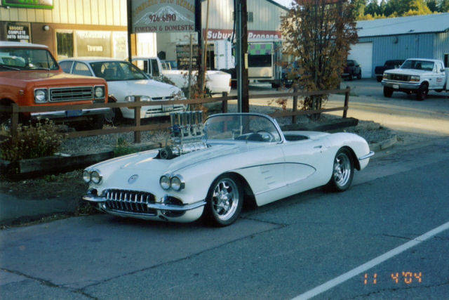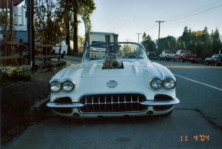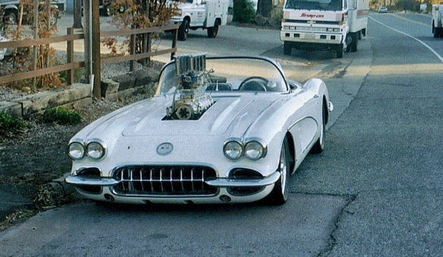 This is a '59 vette thats been 4 linked, disc brakes on all corners and its got a blown fatty with four weber carbs.